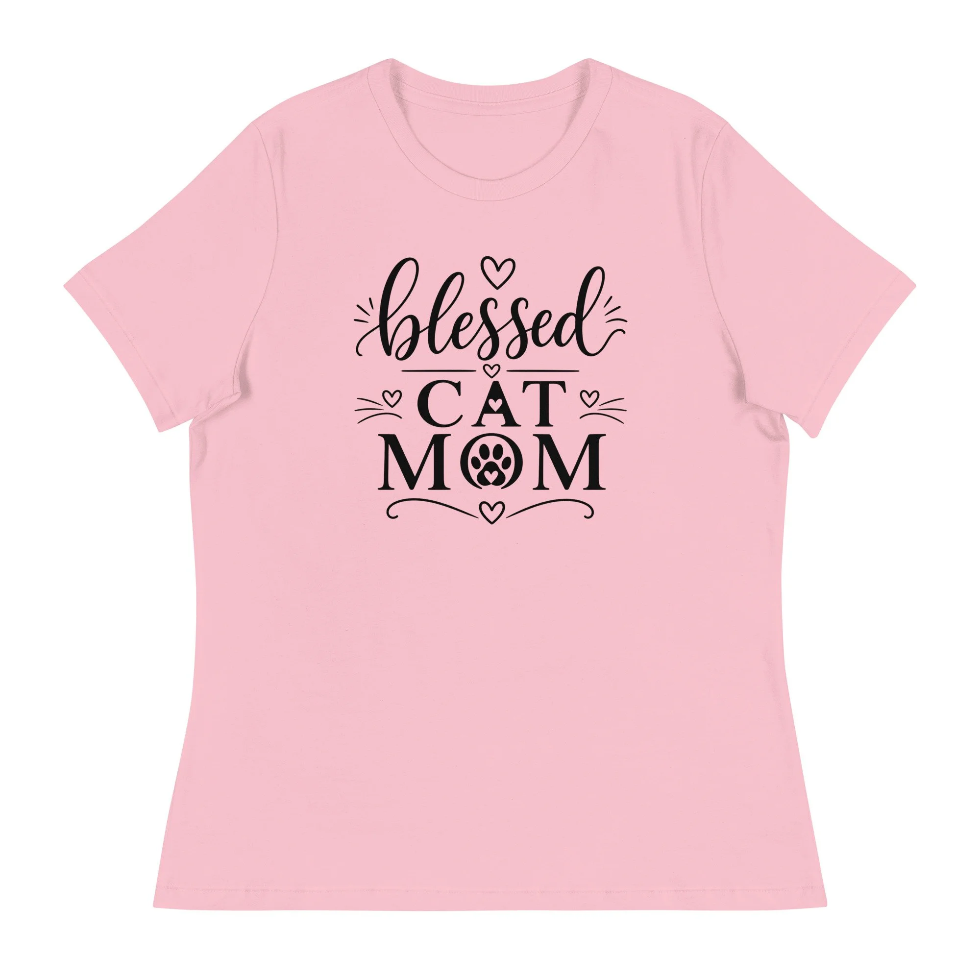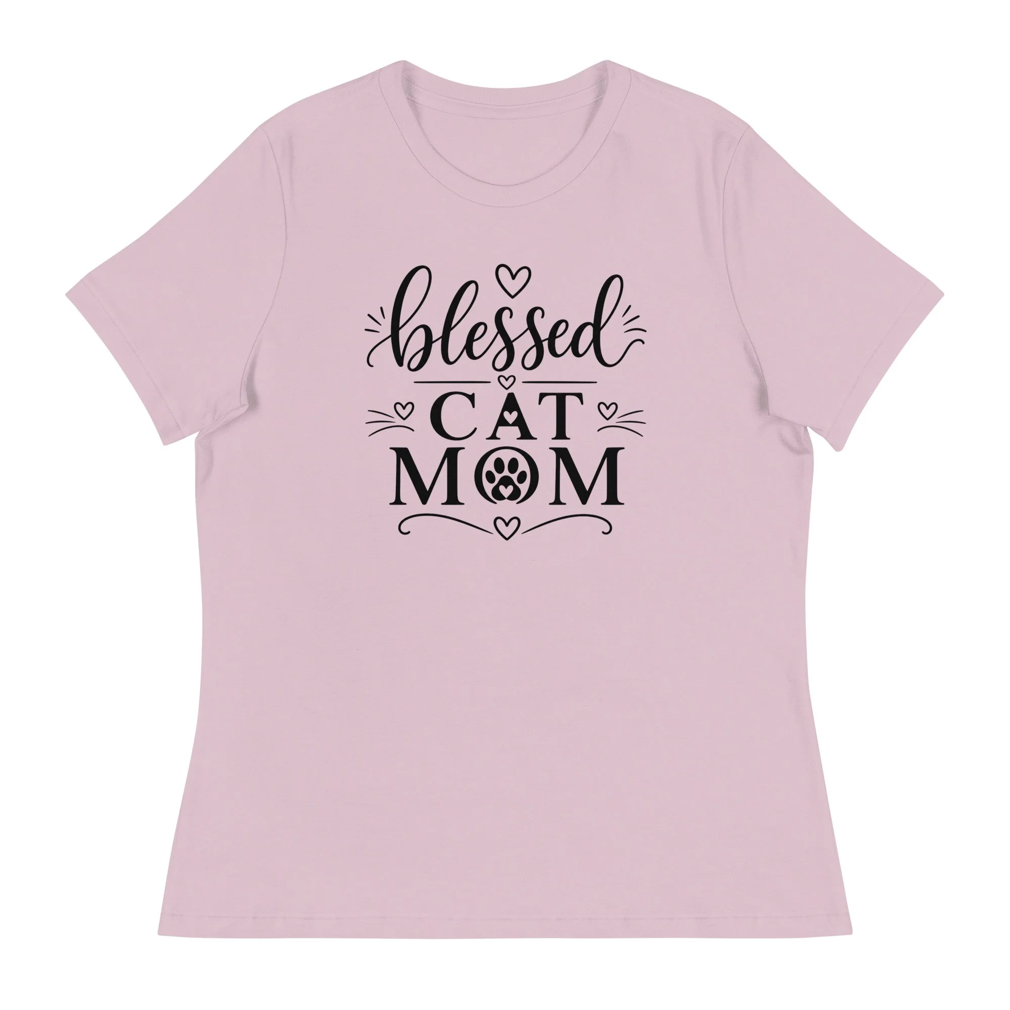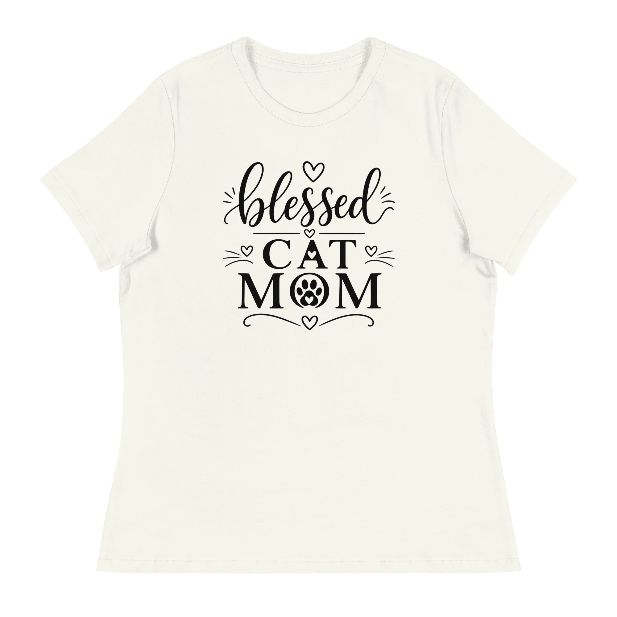 The word “blessed” is written in elegant script, bringing a gentle, feminine feel to the design, while “CAT MOM” is presented in strong, confident lettering. A subtle paw print accent adds a playful touch, while small hearts and minimal flourishes keep the overall look balanced and refined.