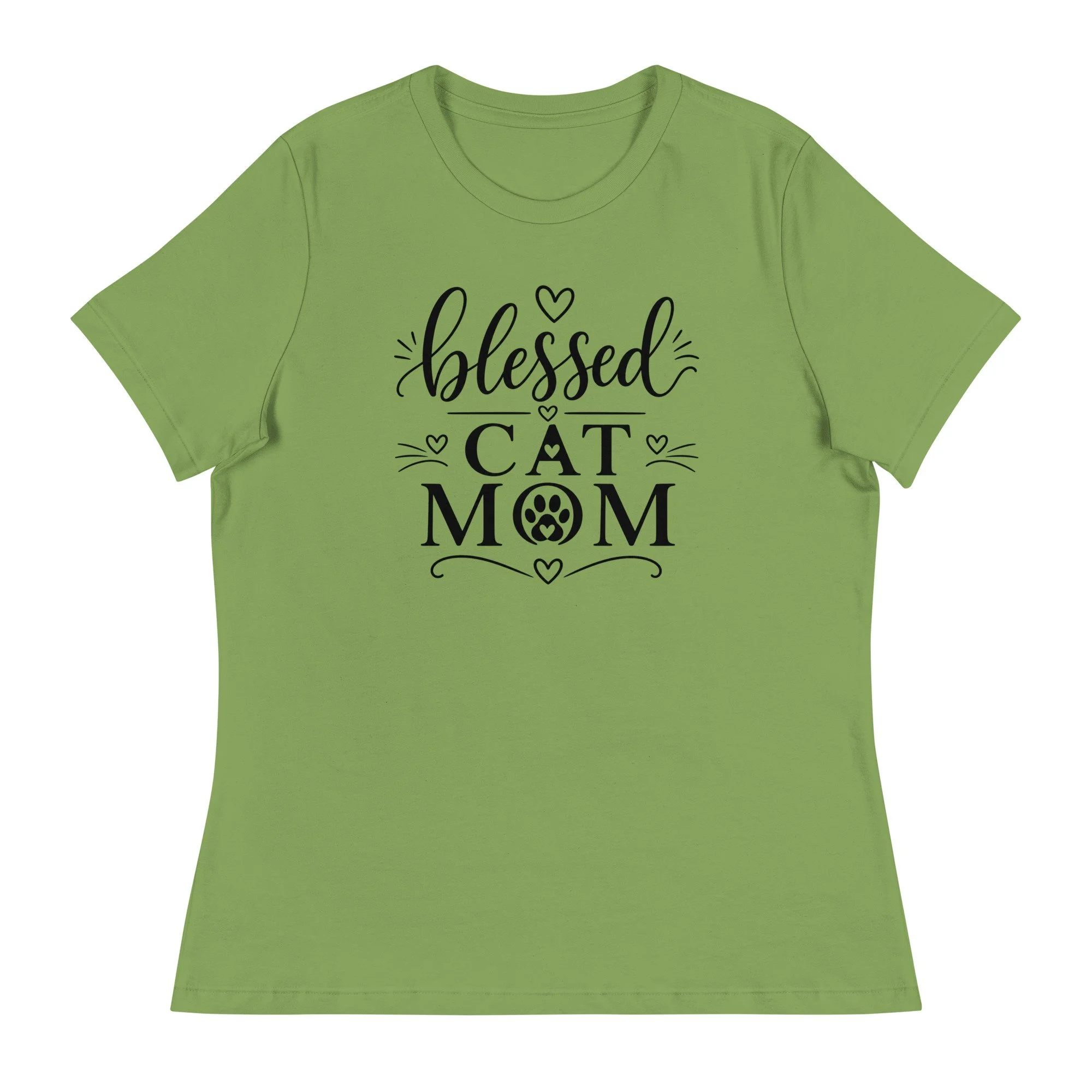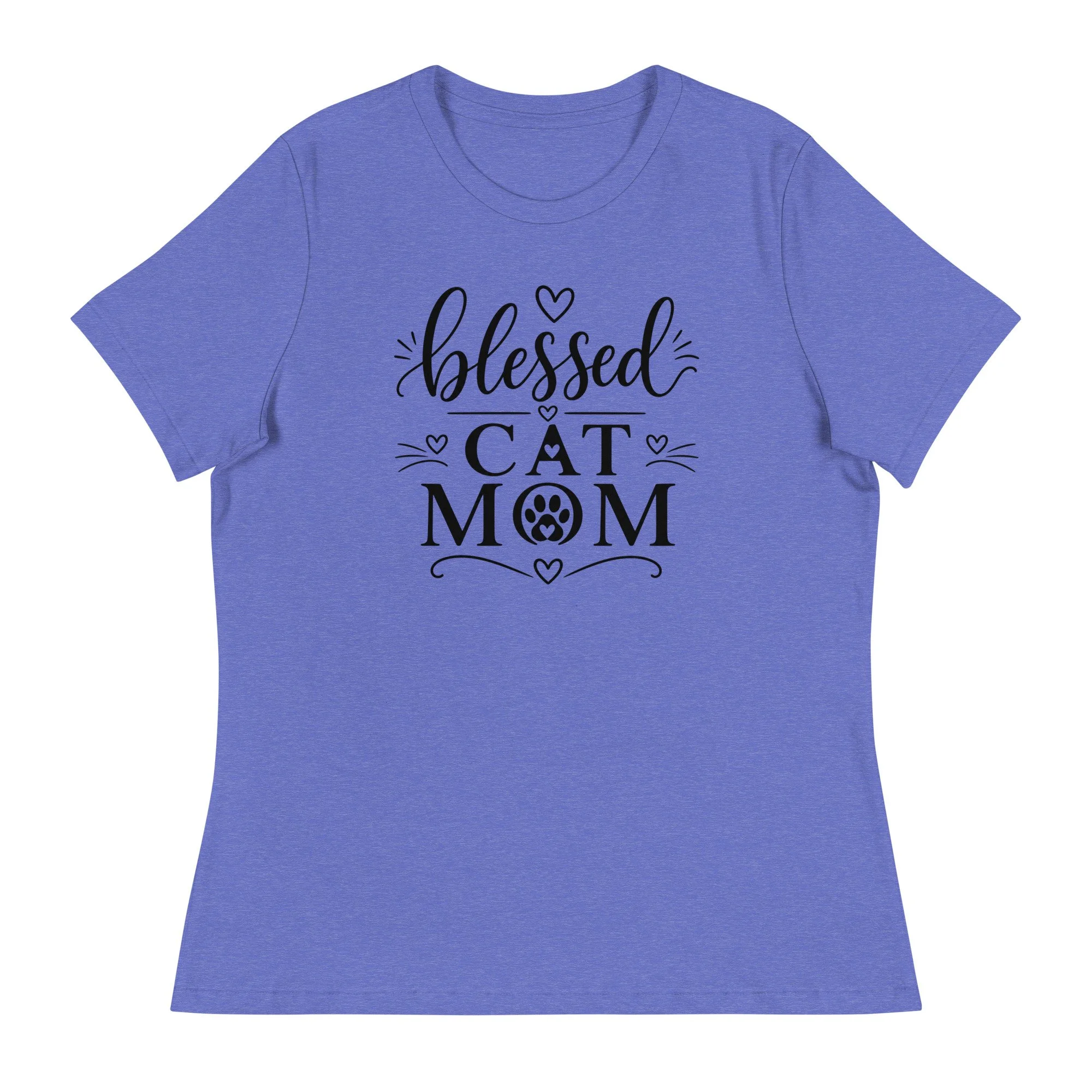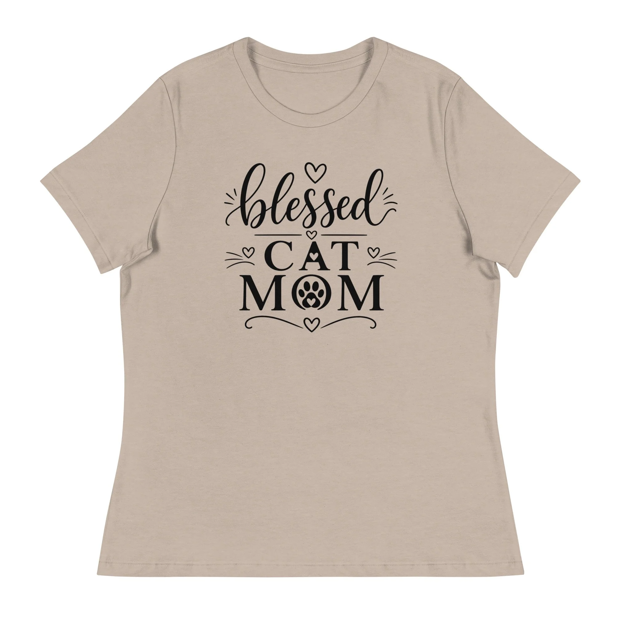 The word “blessed” is written in elegant script, bringing a gentle, feminine feel to the design, while “CAT MOM” is presented in strong, confident lettering. A subtle paw print accent adds a playful touch, while small hearts and minimal flourishes keep the overall look balanced and refined.