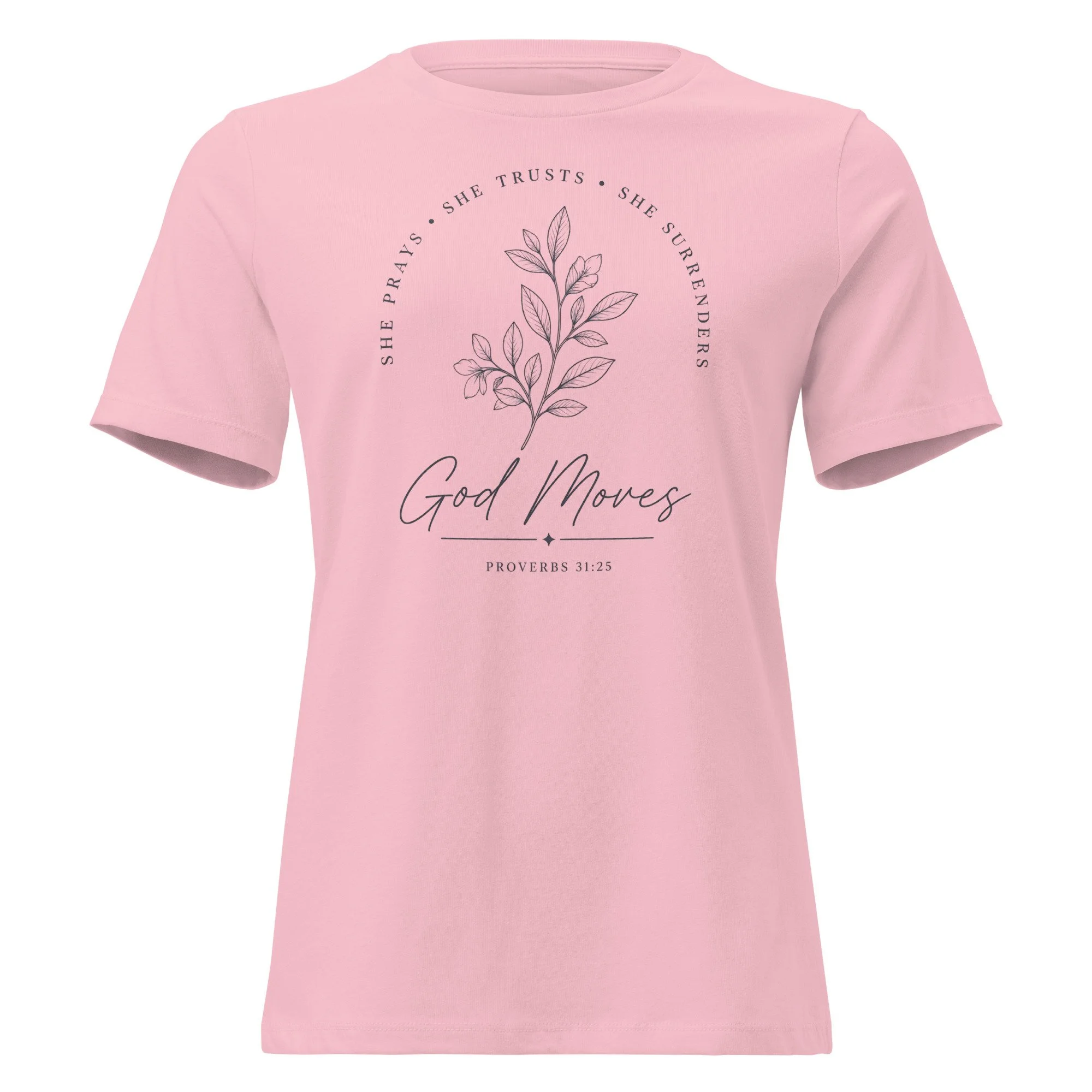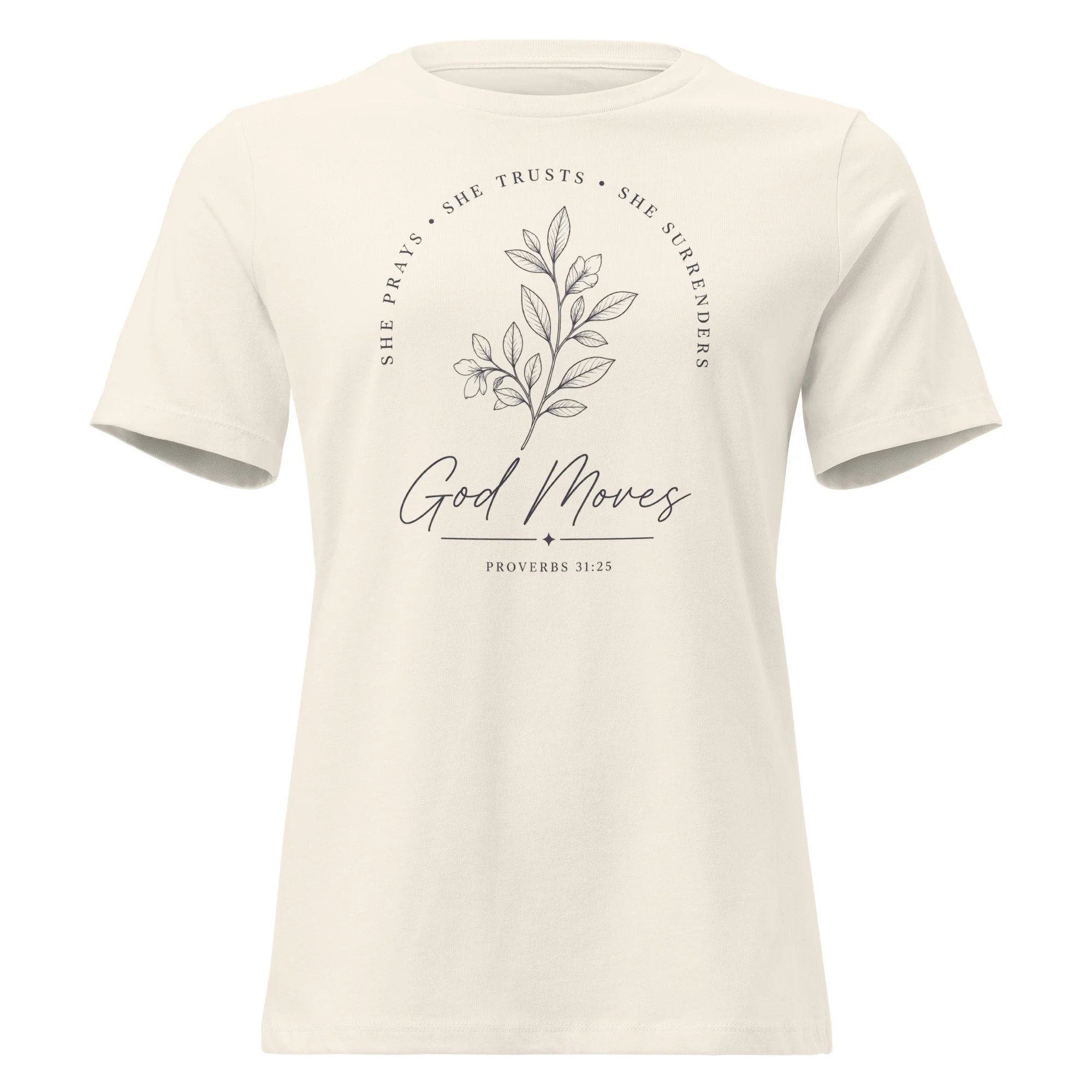 The God Moves Faith Tee (Women’s Fit) is a graceful reminder that God is always working, even when we can’t see it. Inspired by Matthew 17:20, this design pairs a delicate botanical illustration with a powerful declaration of truth: God moves.