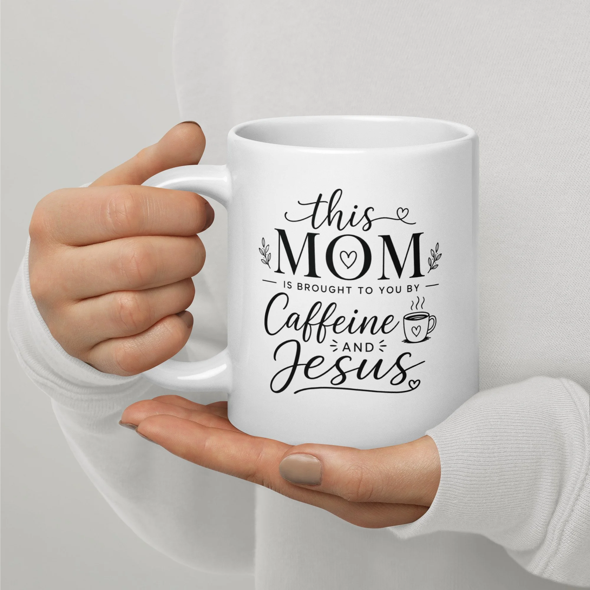 The design features a beautiful mix of elegant script and bold, clean typography, creating a modern, boutique-style look that stands out without feeling overwhelming. The word “Mom” anchors the design with strength, while “Caffeine” and “Jesus” flow in soft, expressive lettering that adds warmth and personality. Subtle details like delicate hearts and a charming coffee cup icon bring a cozy, personal touch to the overall design.