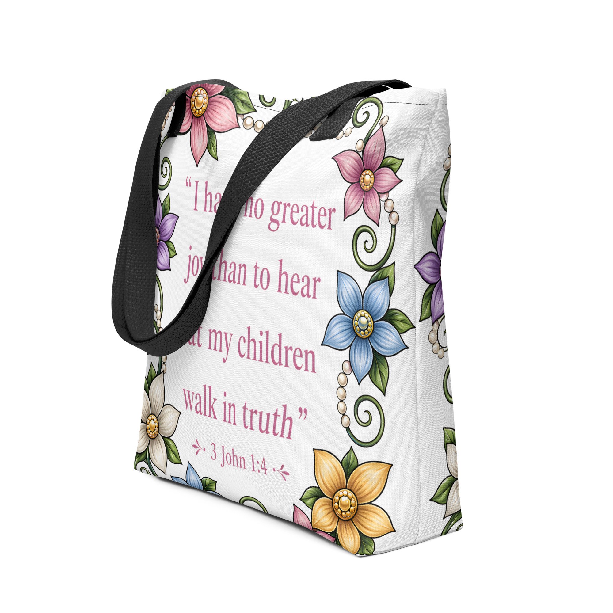 The “Walk in Truth” Scripture Tote Bag is more than just a bag—it’s a statement of faith, love, and legacy you can take with you wherever you go. Featuring the powerful words of 3 John 1:4, this design declares a truth that resonates deeply: “I have no greater joy than to hear that my children walk in truth.”