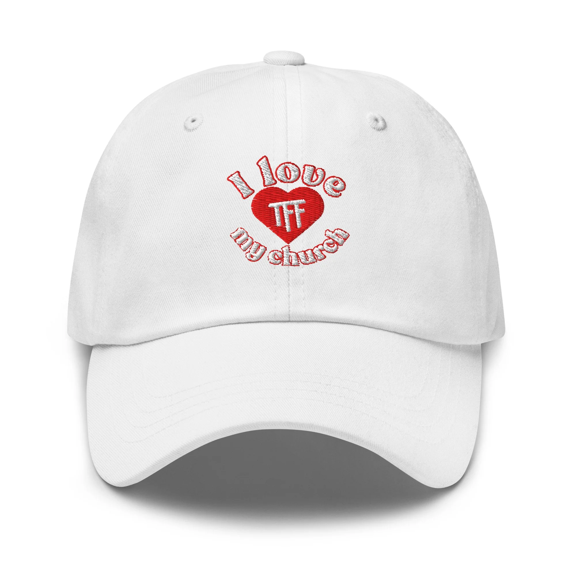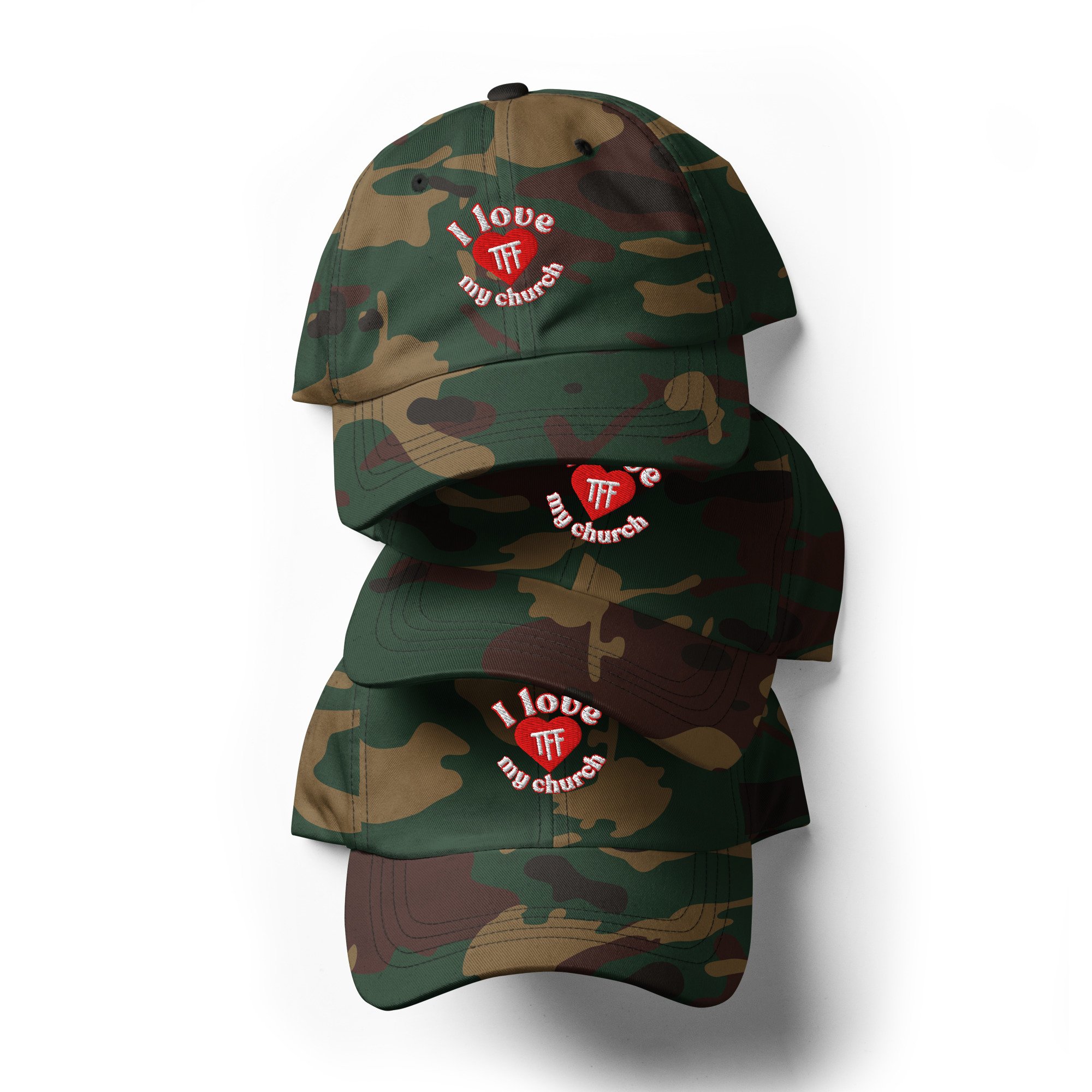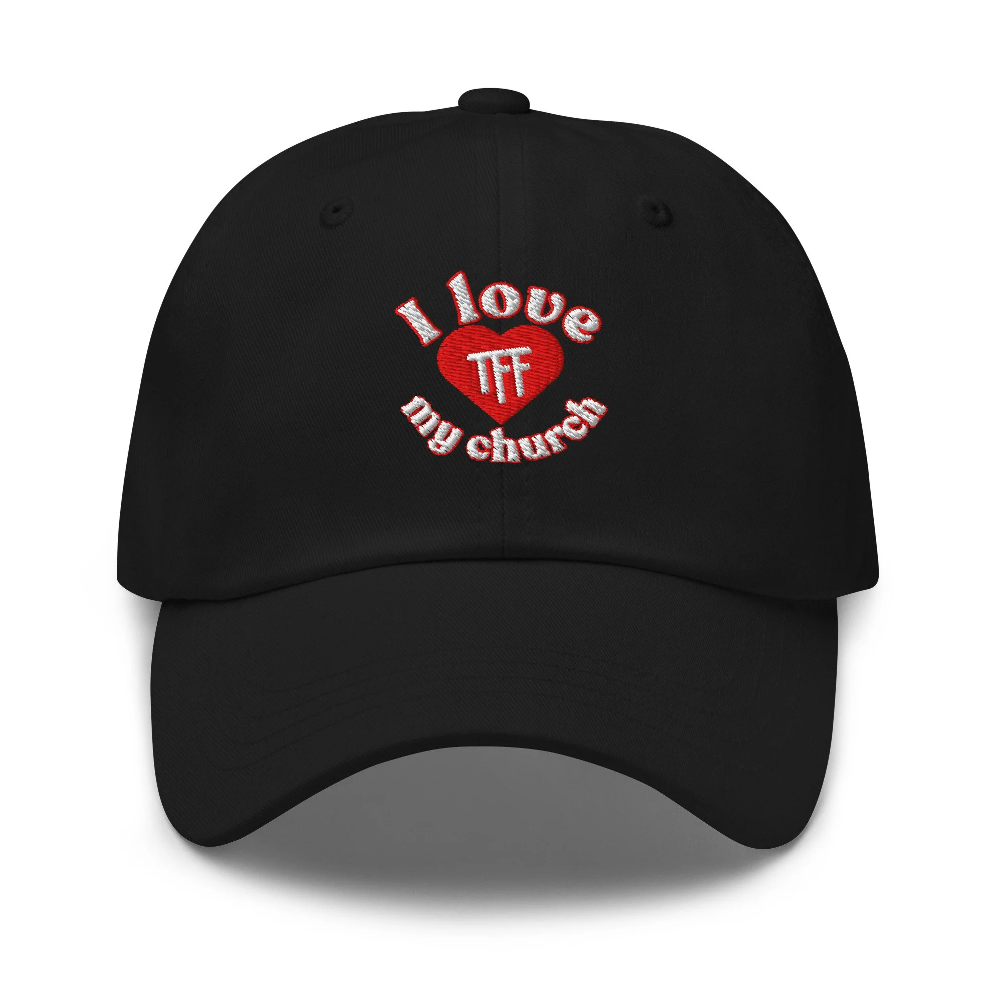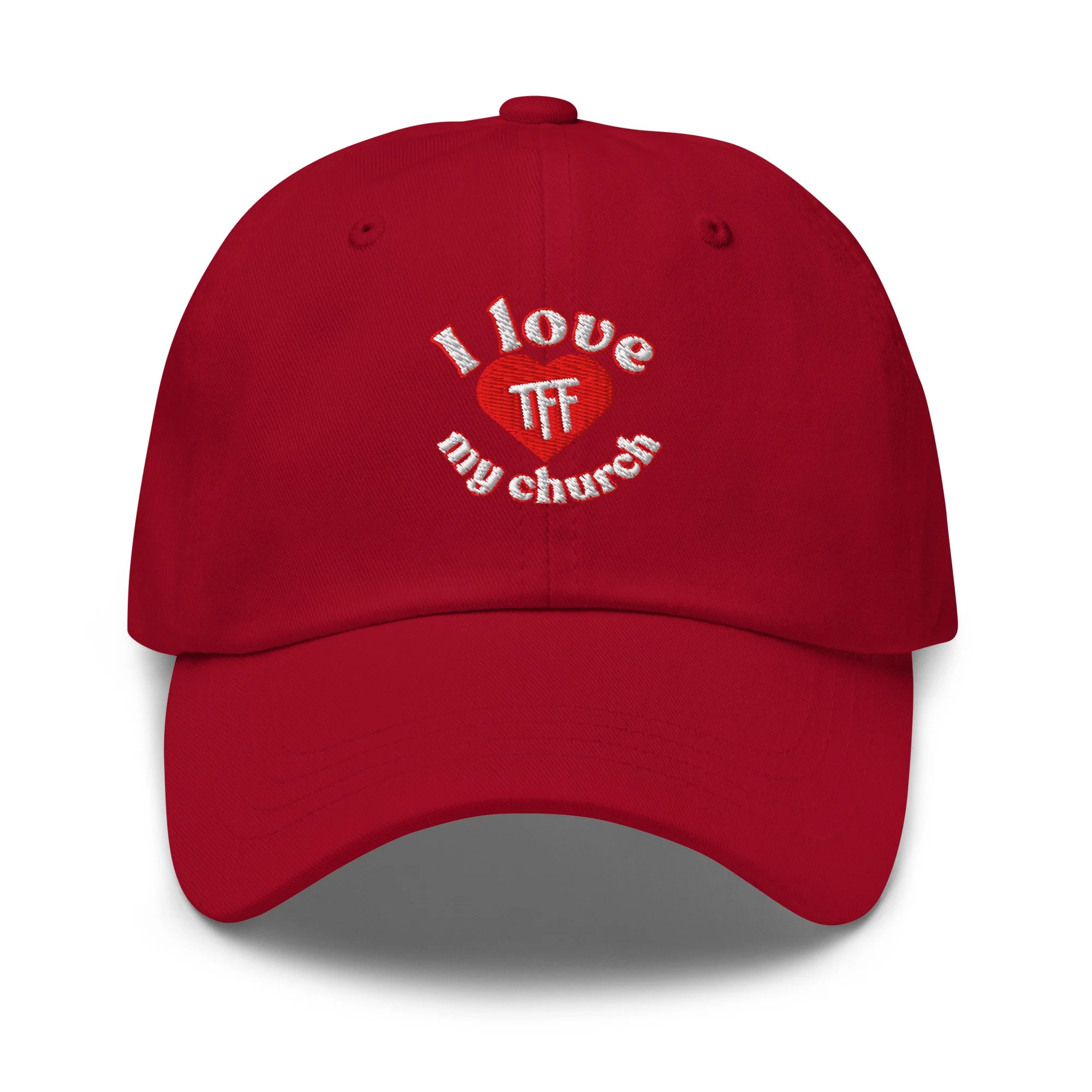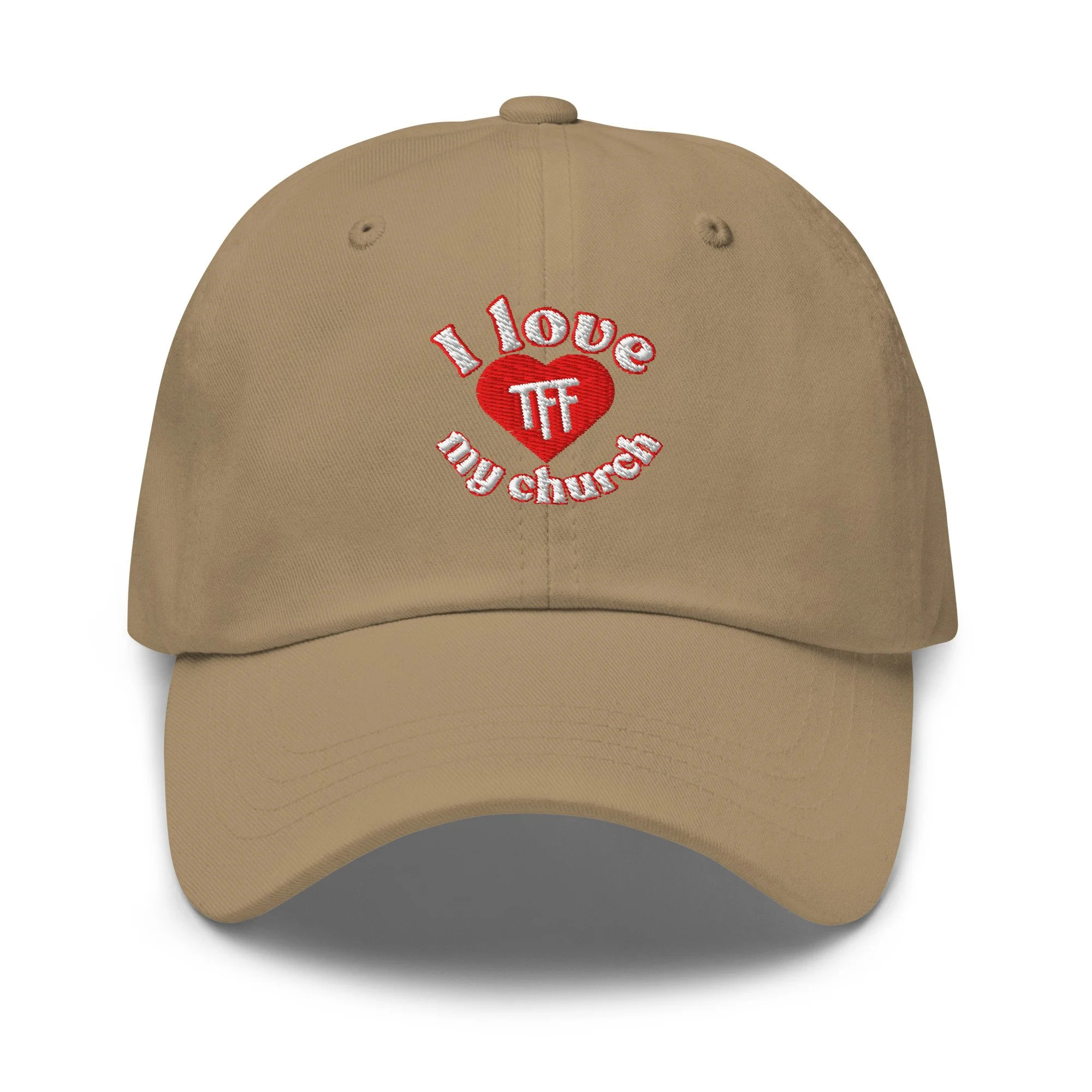 This “I Love My Church” dad hat is the perfect everyday piece to represent your church family wherever you go. Featuring a minimal embroidered TFF heart design, it’s a subtle but powerful way to show your love for what God is doing at TFF.