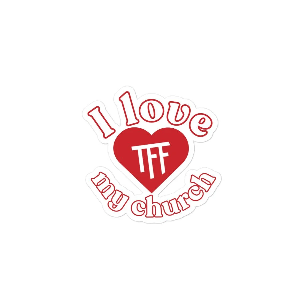 Take your love for TFF everywhere you go. This bold, eye-catching sticker is more than just a design—it’s a statement. Whether it’s on your car, laptop, water bottle, or notebook, it’s a simple way to represent your church and spark conversations wherever you are.