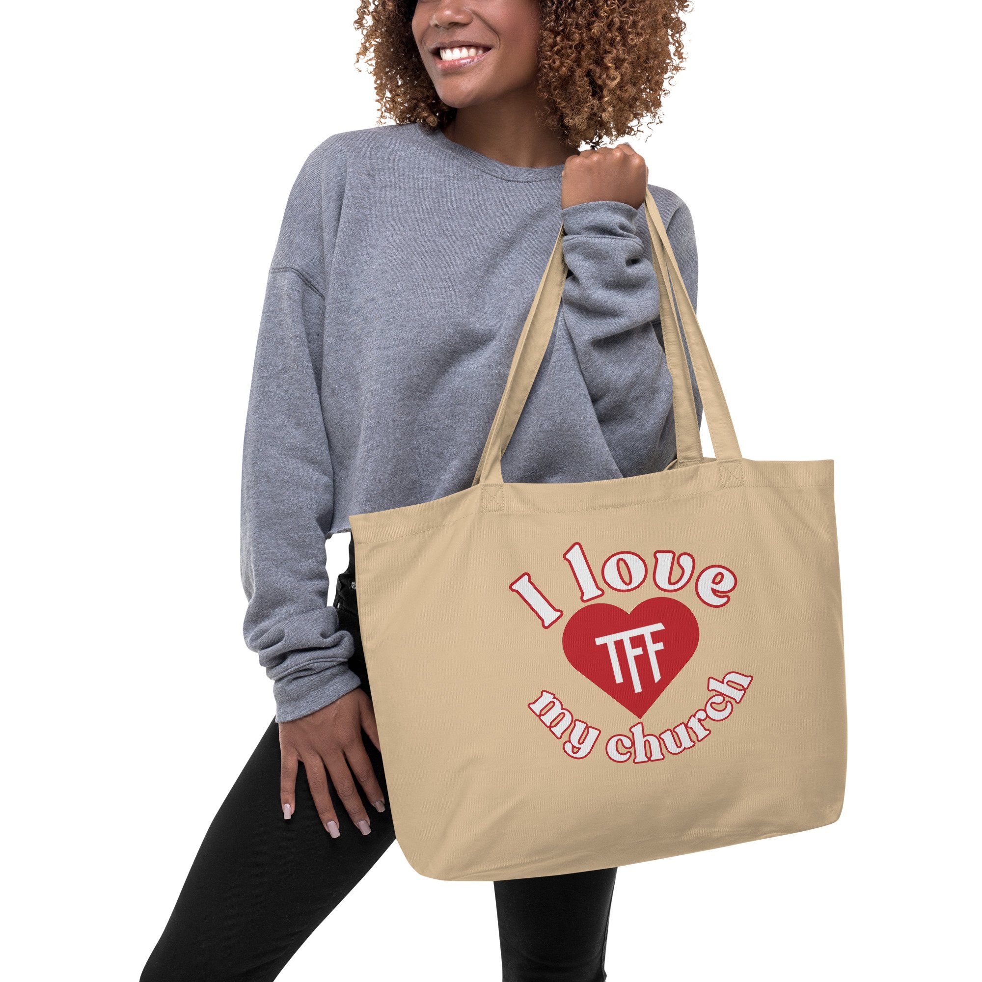 Carry more than just your essentials—carry what you believe in. This oversized “I Love My Church” tote is built for real life, giving you the space you need while boldly representing your love for TFF everywhere you go.