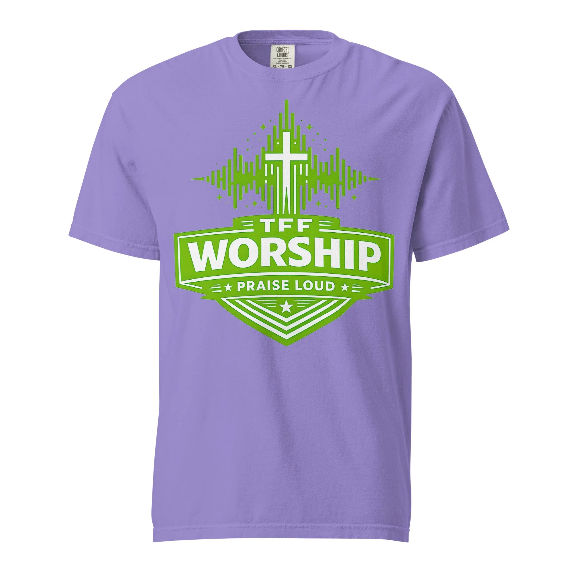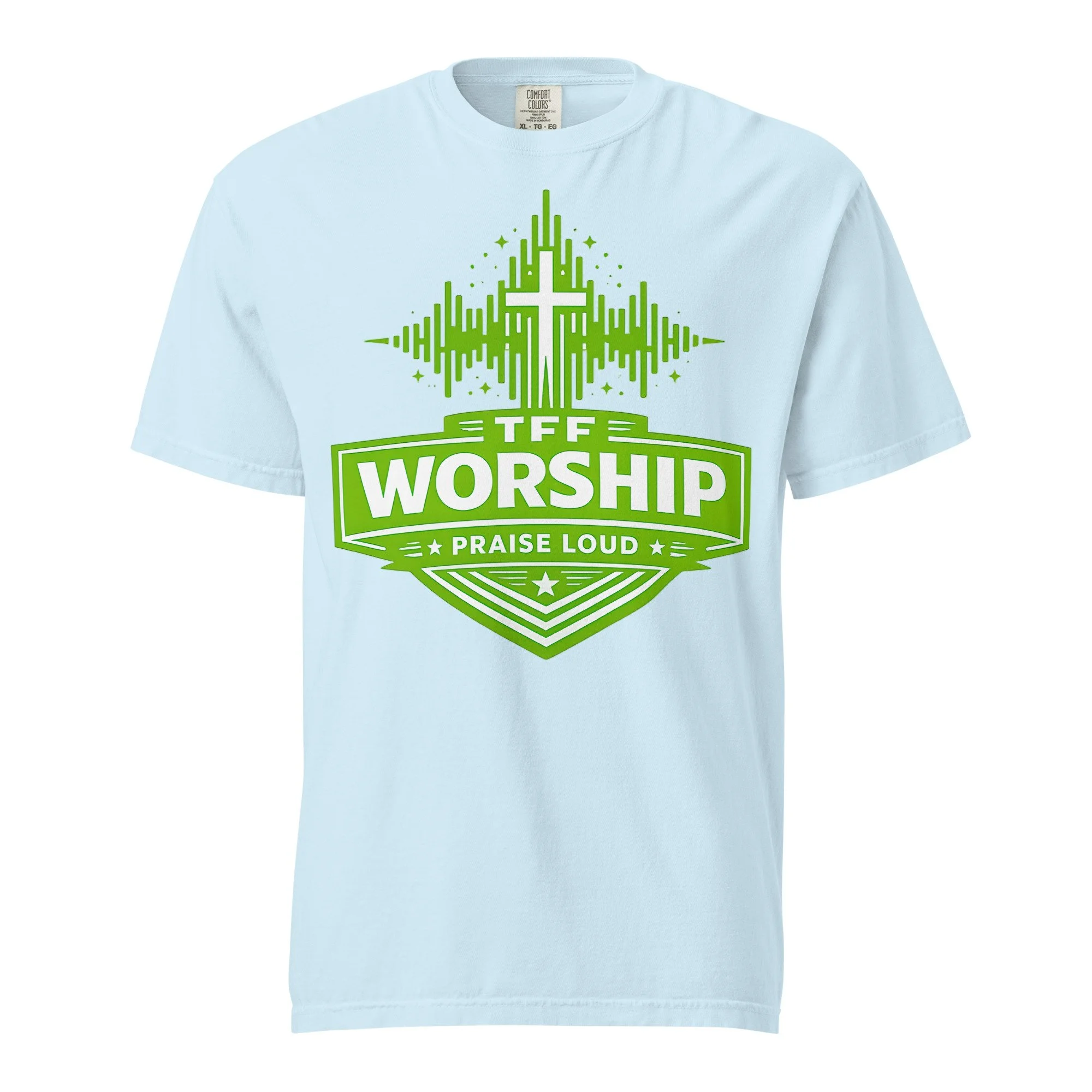 The “TFF Worship – Praise Loud” Tee is designed for those who aren’t afraid to express their faith boldly. Featuring a clean, modern design with soundwave-inspired elements, this shirt represents the power of worship that goes beyond music—it’s a lifestyle.