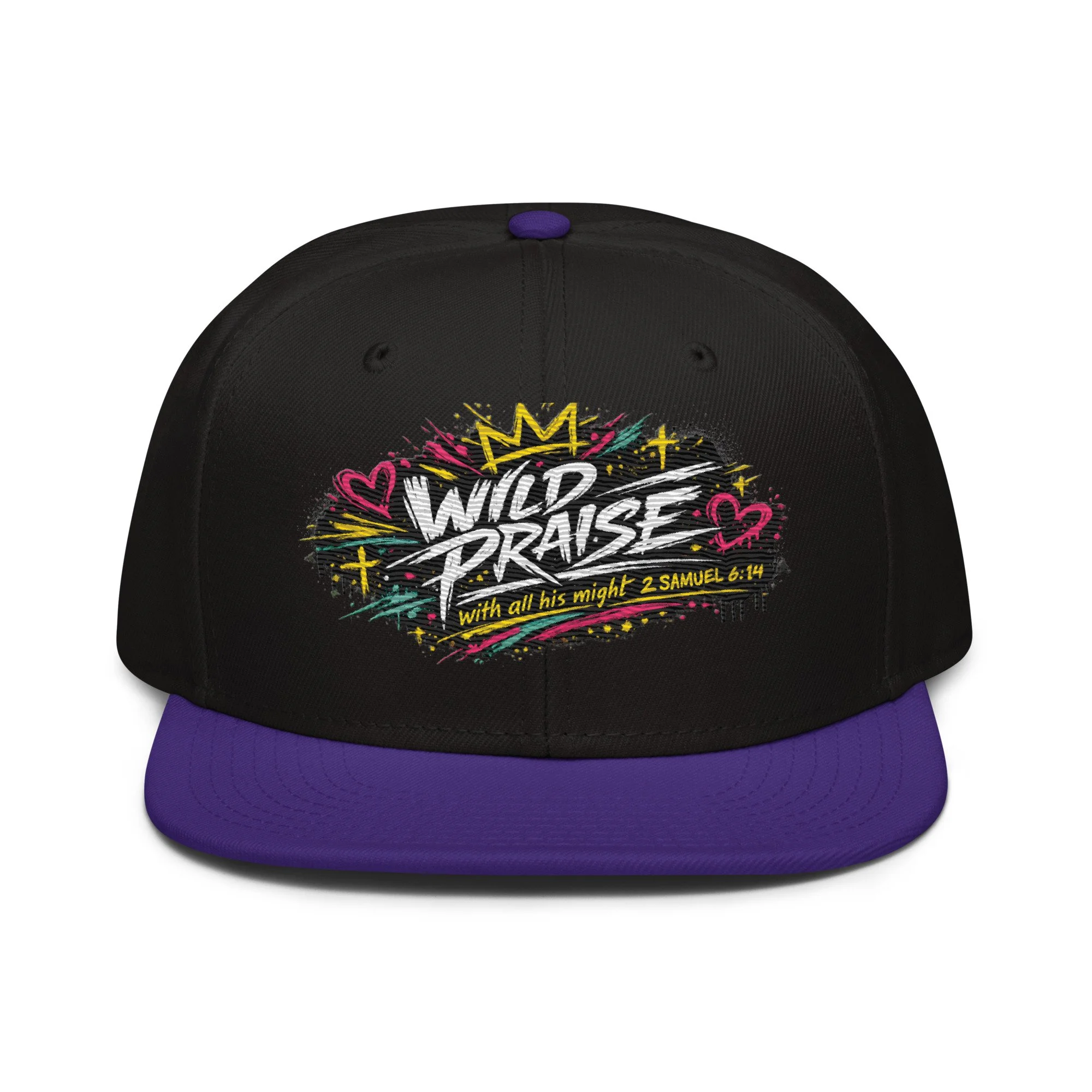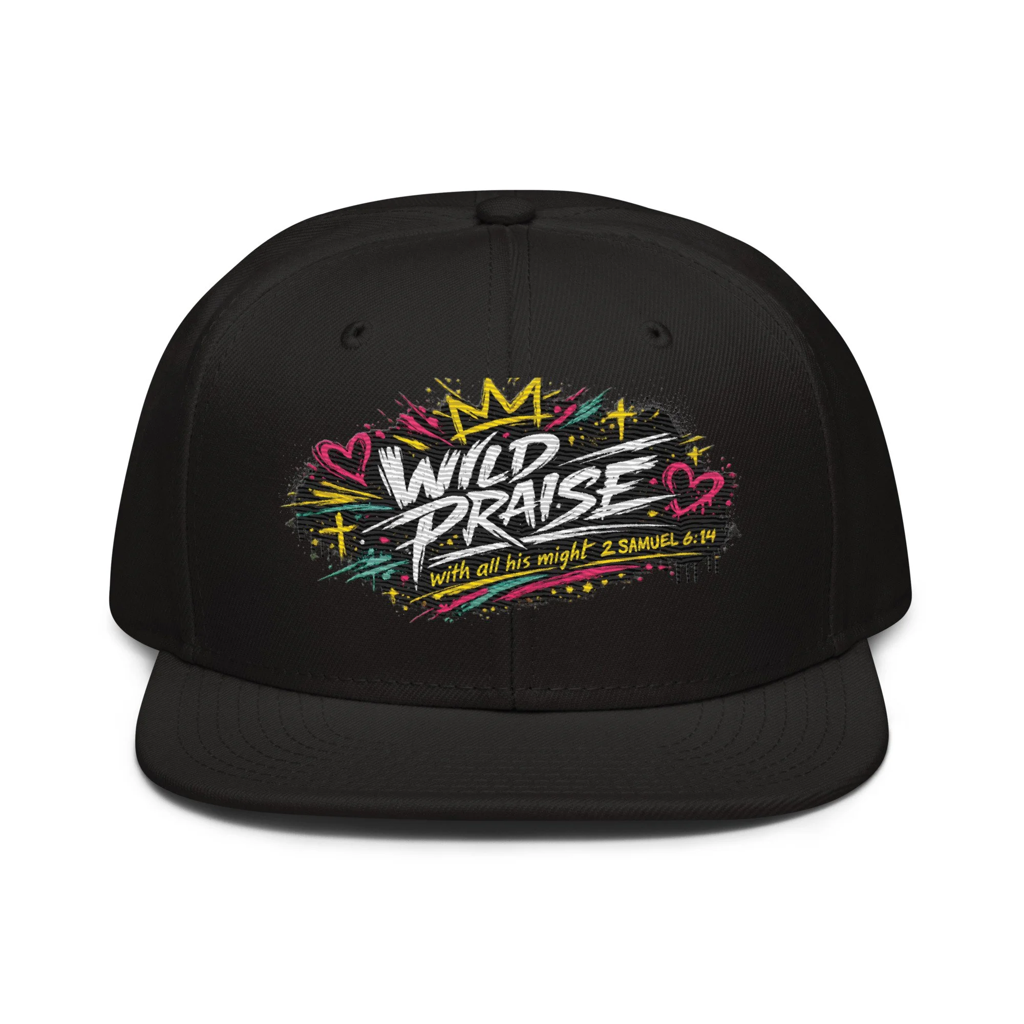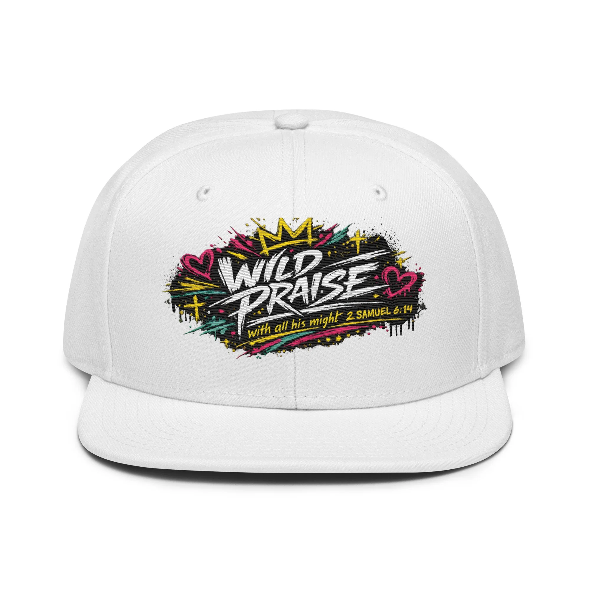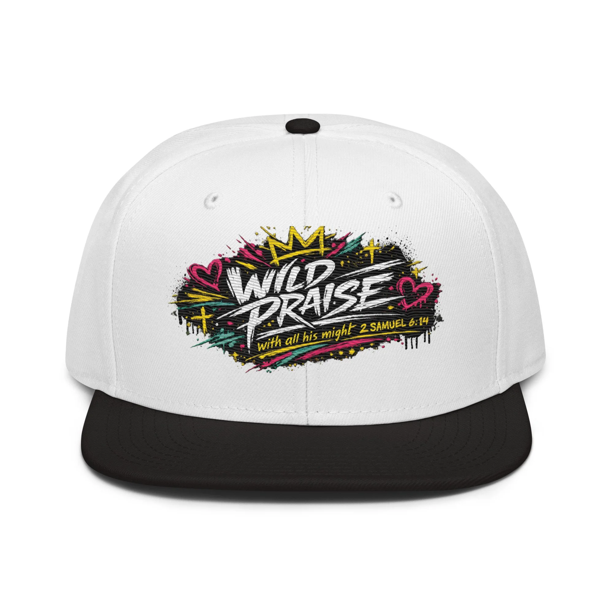 Wild Praise Snapback brings bold faith and streetwear energy together in one clean statement piece. Inspired by 2 Samuel 6:14, this design reflects the kind of praise that is passionate, unashamed, and all in. With vibrant graffiti-style artwork, crown details, hearts, crosses, and electric paint accents, this snapback was made for those who want their style to speak life, joy, and worship.