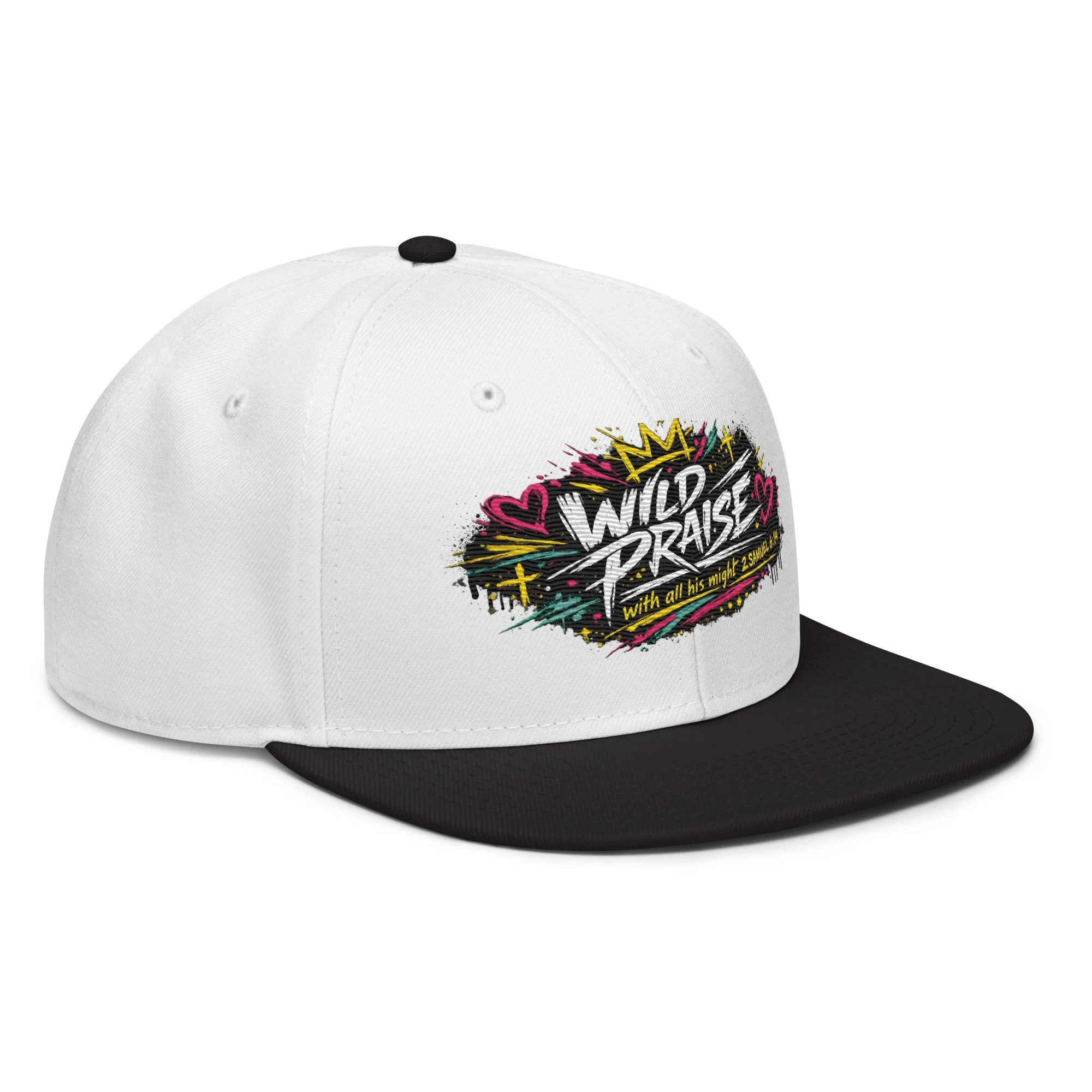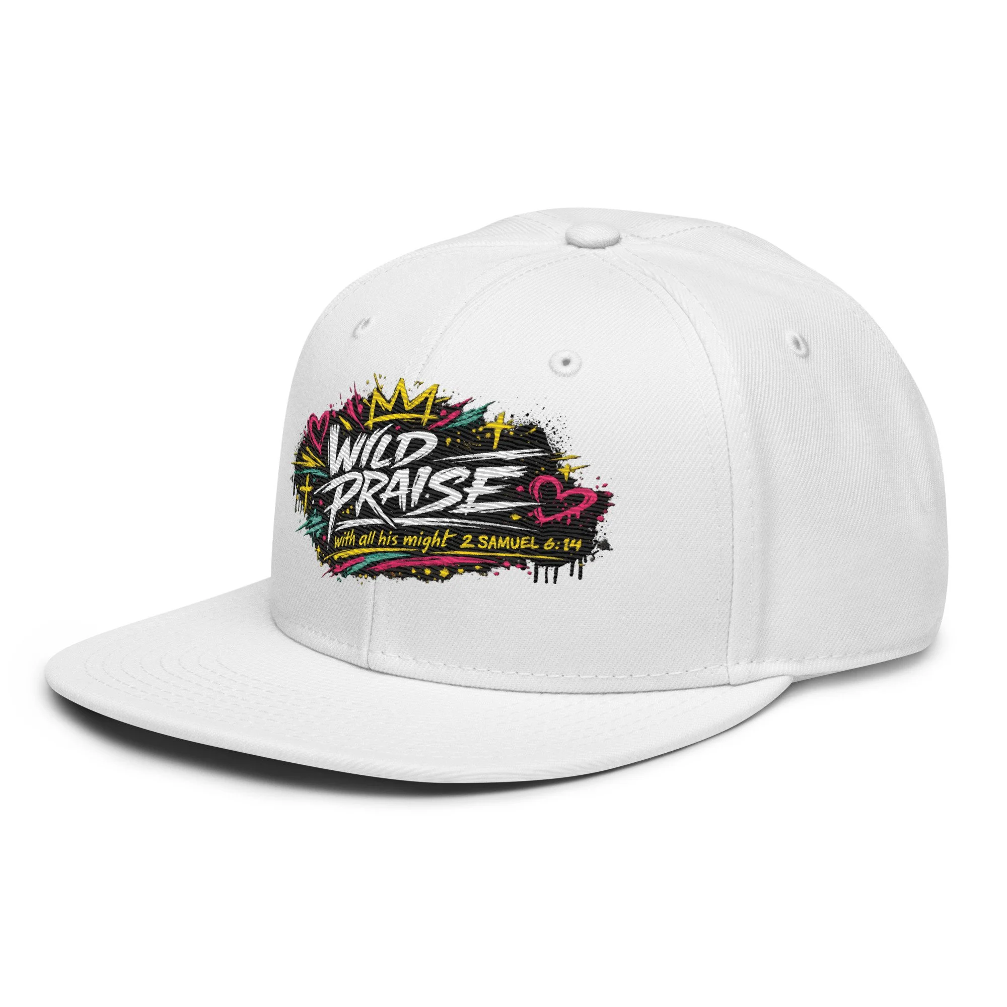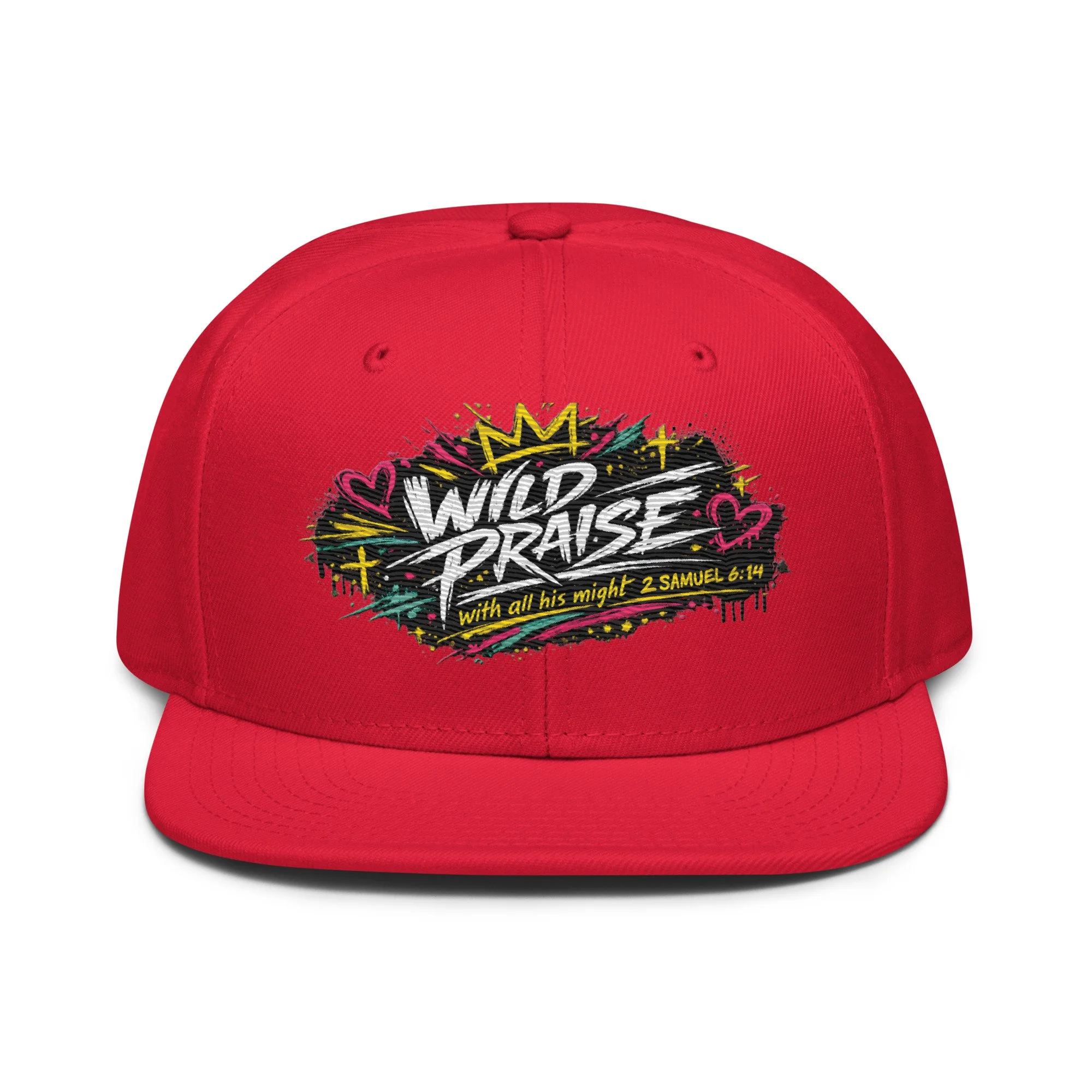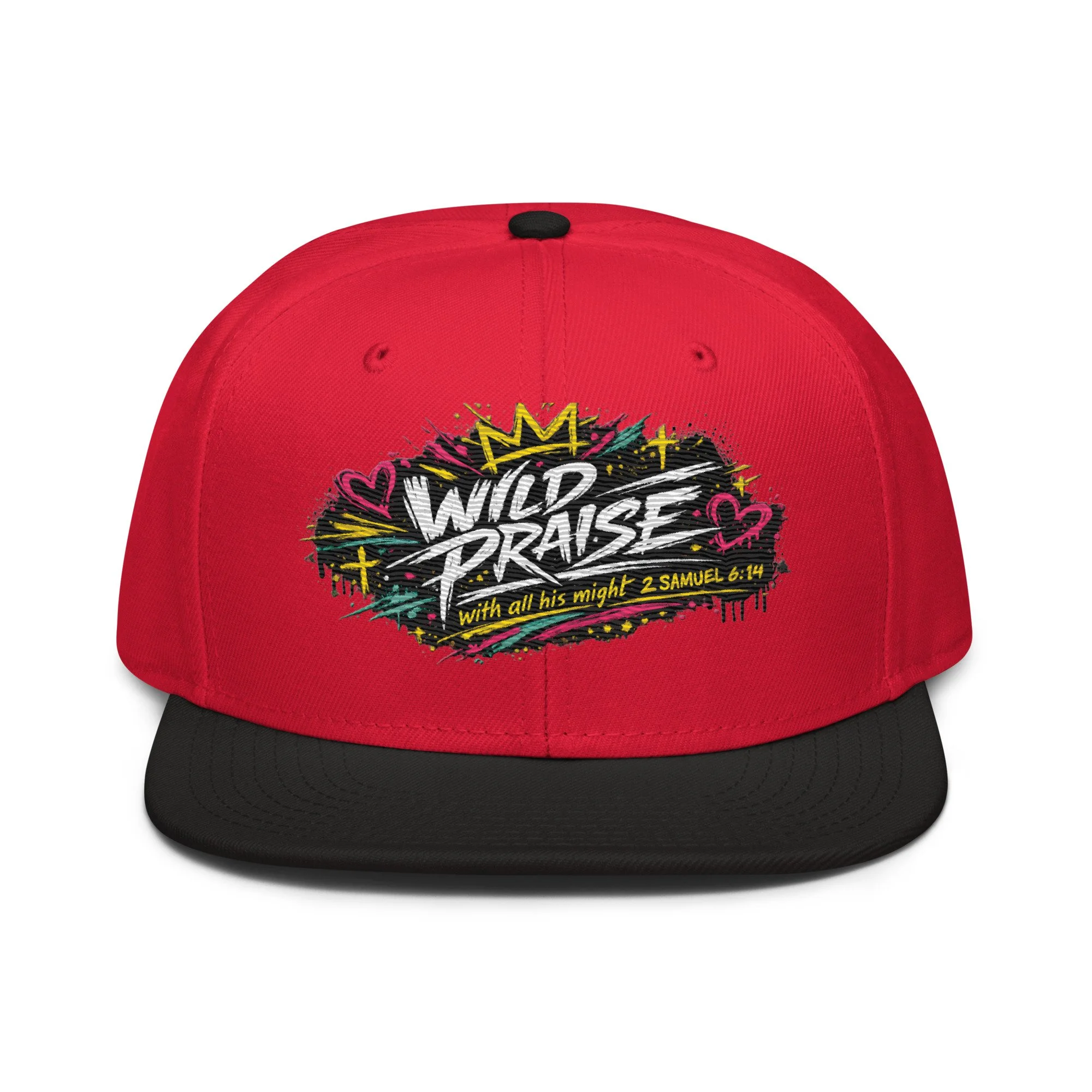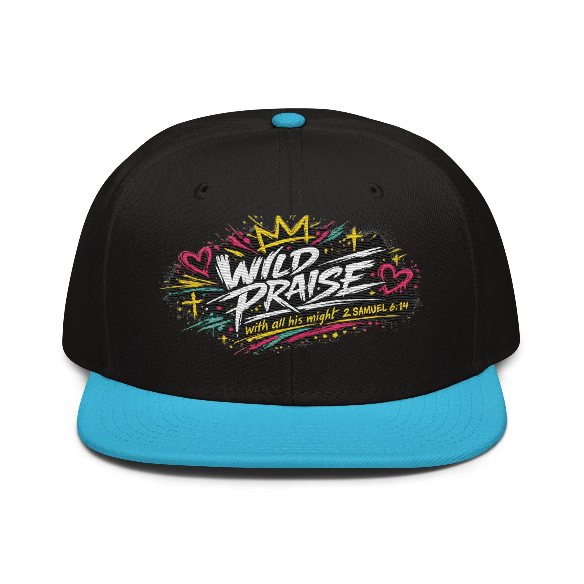 Wild Praise Snapback brings bold faith and streetwear energy together in one clean statement piece. Inspired by 2 Samuel 6:14, this design reflects the kind of praise that is passionate, unashamed, and all in. With vibrant graffiti-style artwork, crown details, hearts, crosses, and electric paint accents, this snapback was made for those who want their style to speak life, joy, and worship.