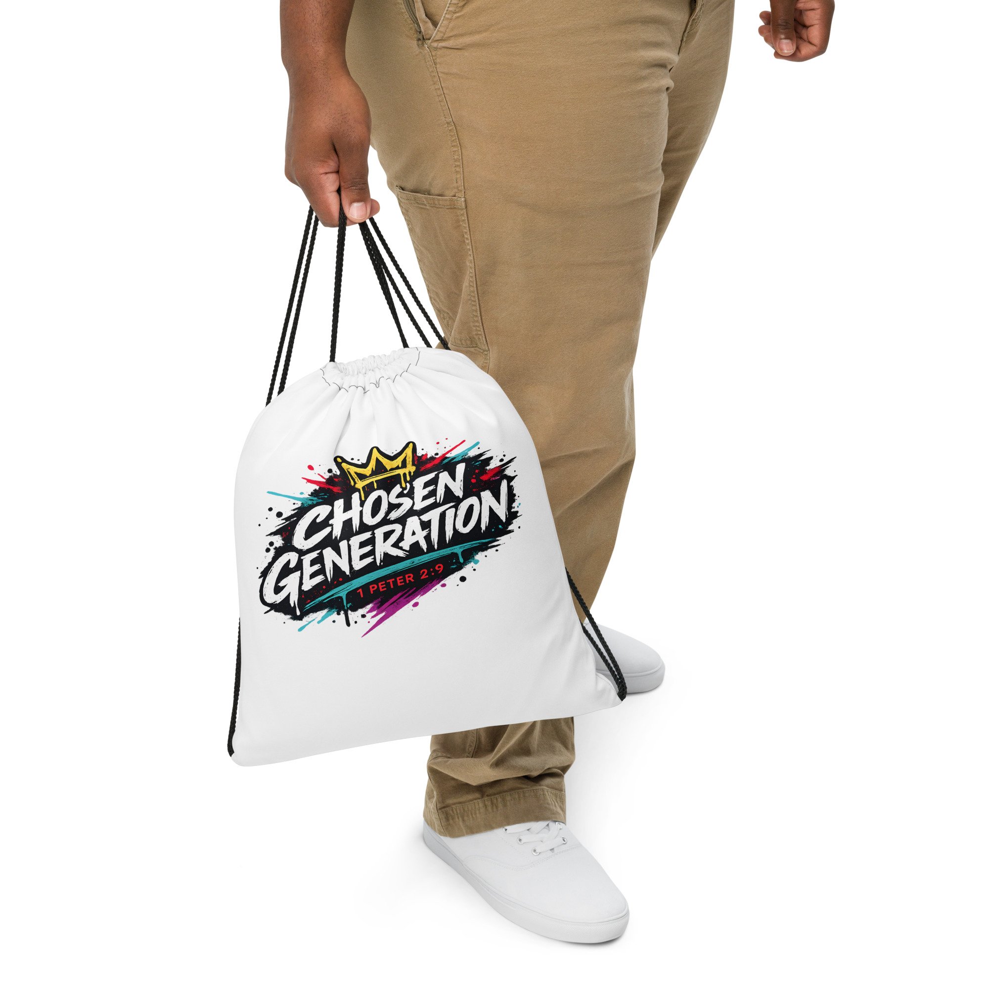 The design has a modern, high-impact look with expressive typography and a radiant central graphic that gives it strong visual energy. It feels uplifting, faith-filled, and easy to wear in everyday life, making it more than just a tote — it becomes a statement piece that carries purpose along with your essentials.